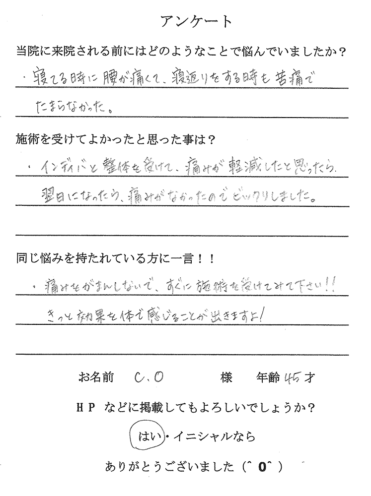 インディバと整体を受けて、痛みが軽減したと思ったら痛みがなかったのでビックリしました。