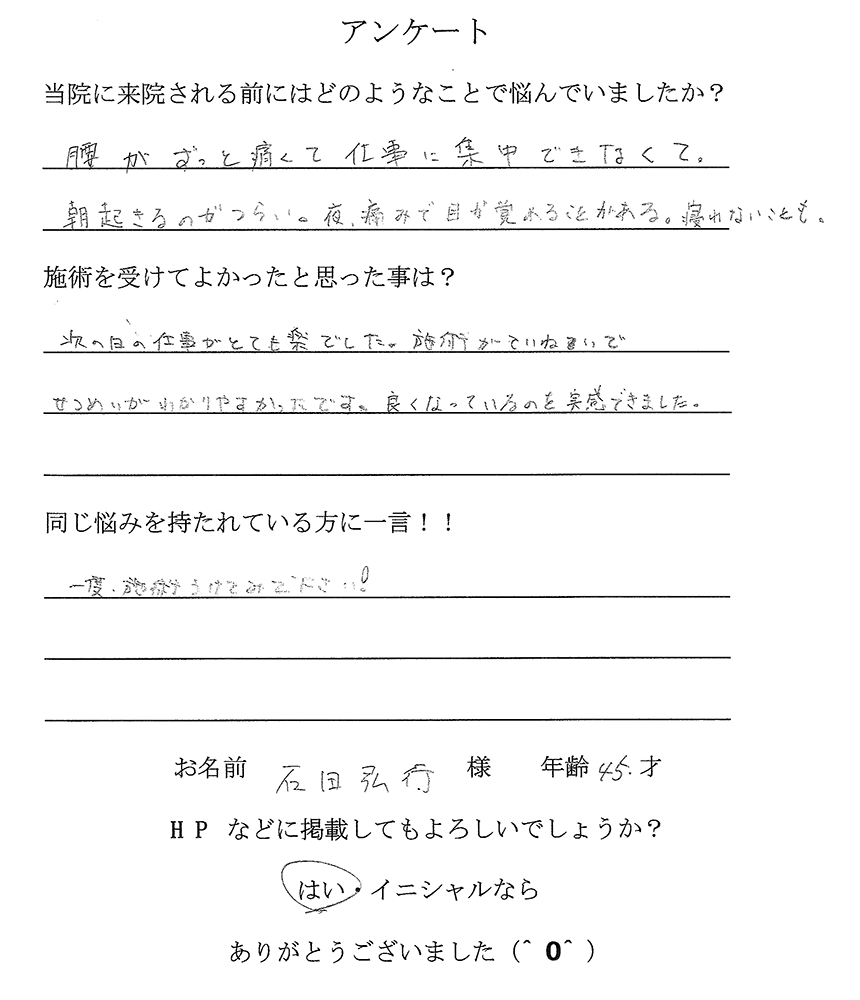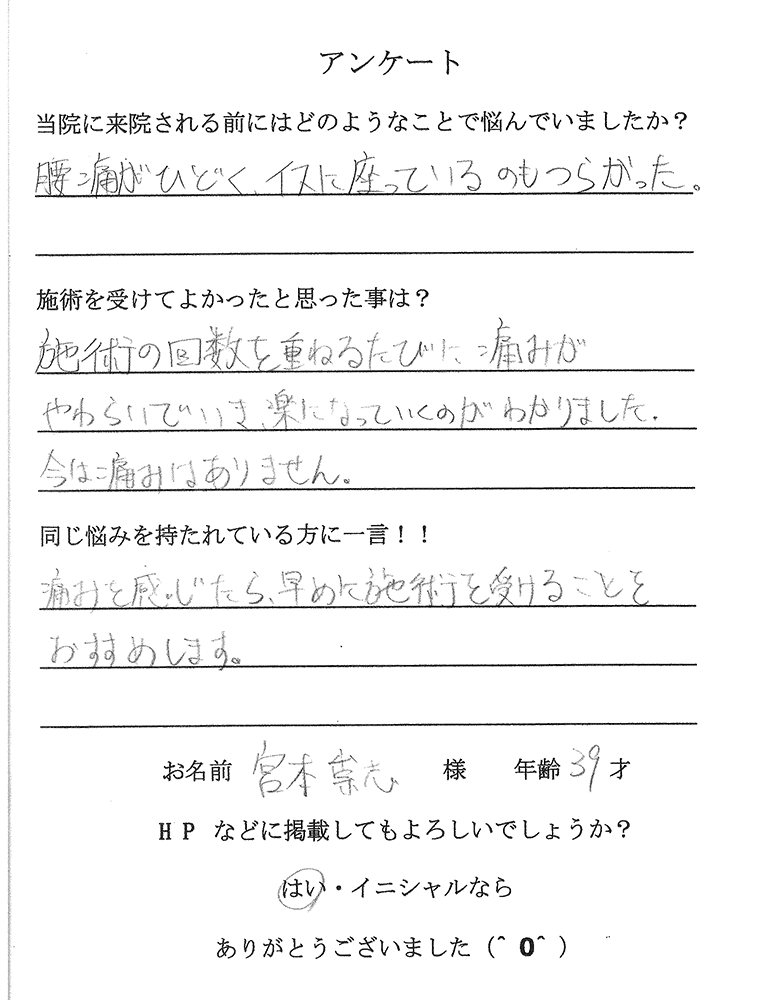 次の日の仕事がとても楽でした。施術が丁寧で説明がわかりやすかったです。